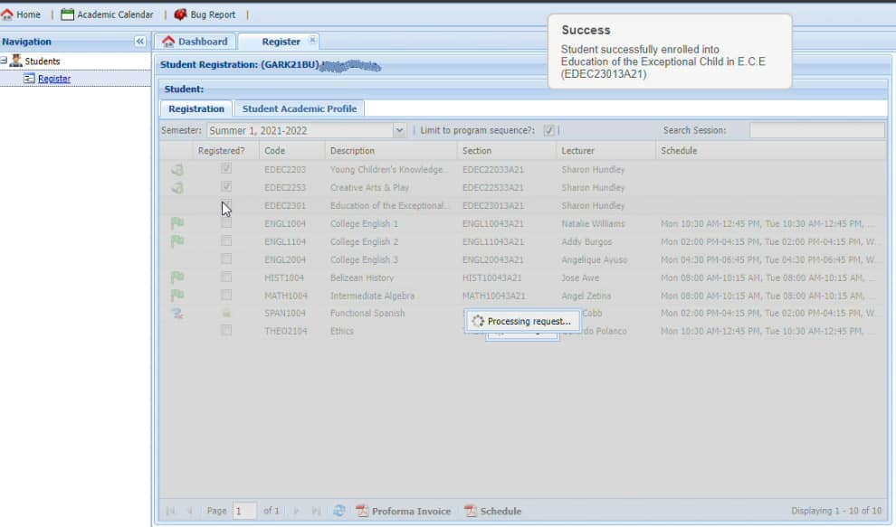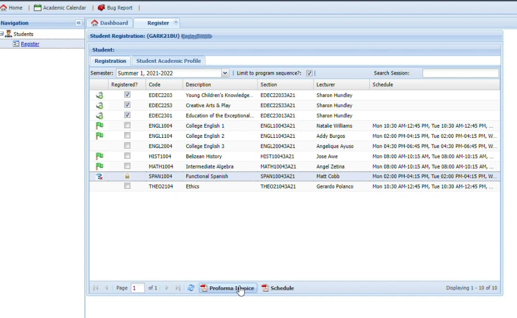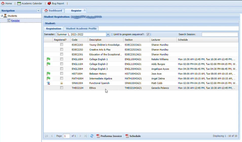 Step 5: After you click on the semester listed on the drop down menu, the courses available for that current semester will be listed below. For this example, it is Summer 1.