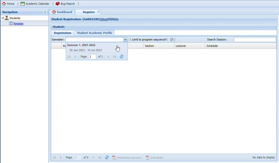 Step 4: Under the Registration tab, click on the drop down menu beside Semester. On the drop down menu, the current semester or summer will be listed.